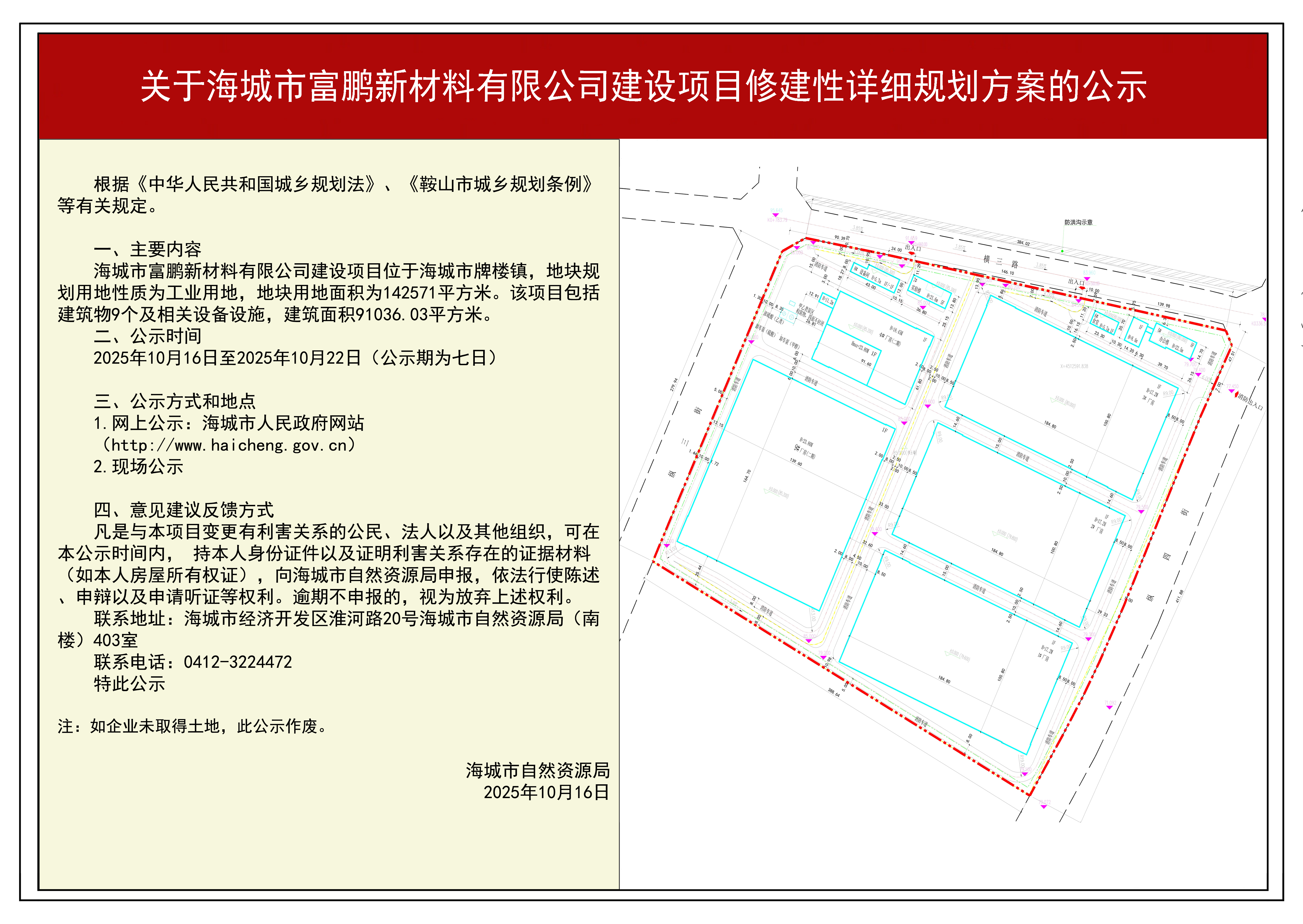 为切实增强规划的科学性、合理性和可行性,征求公众意见,根据《中华人民共和国城乡规划法》第二十六条规定,现将海城市富鹏新材料有限公司建设项目修建性详细规划方案内容公告如下: