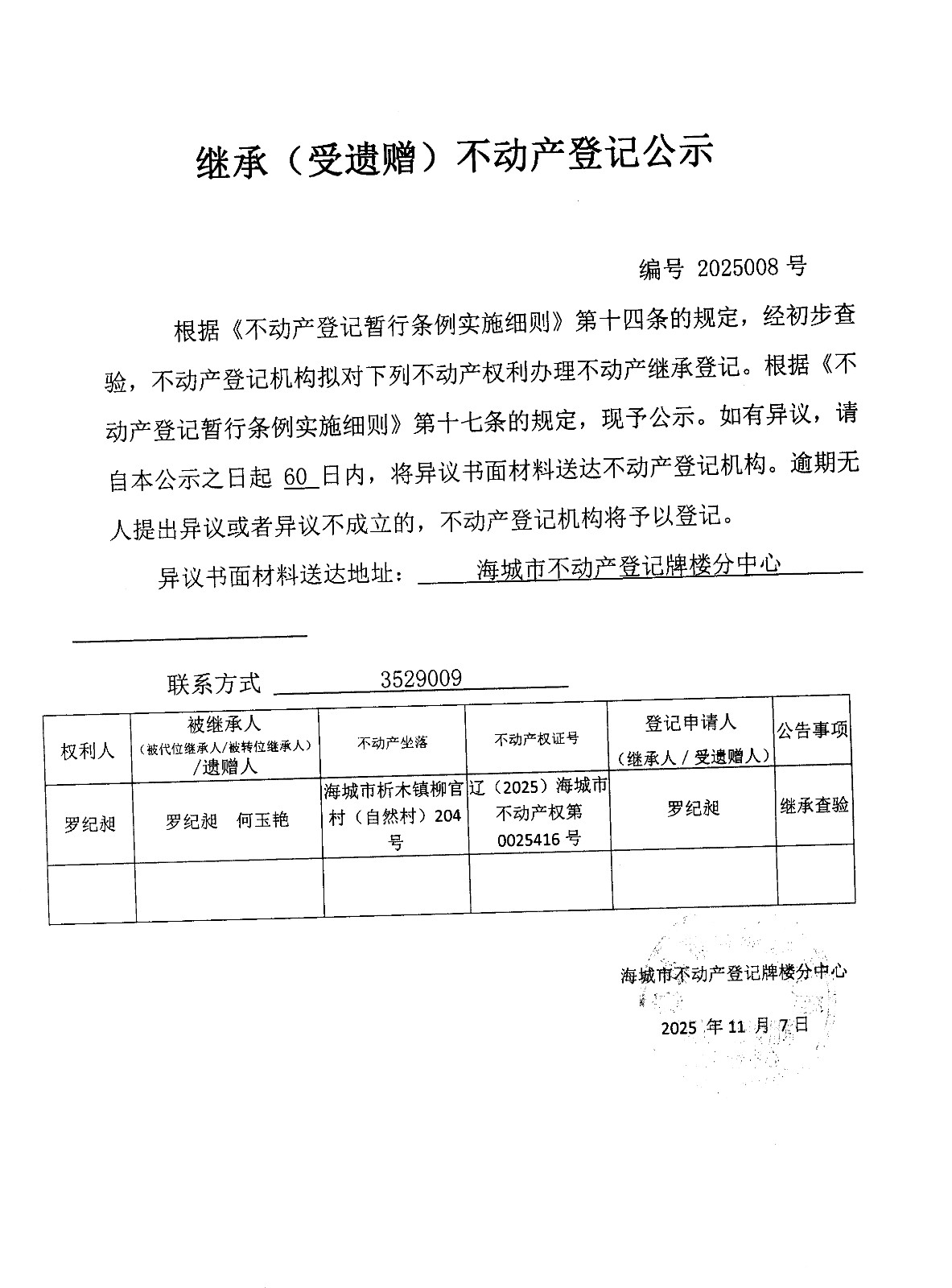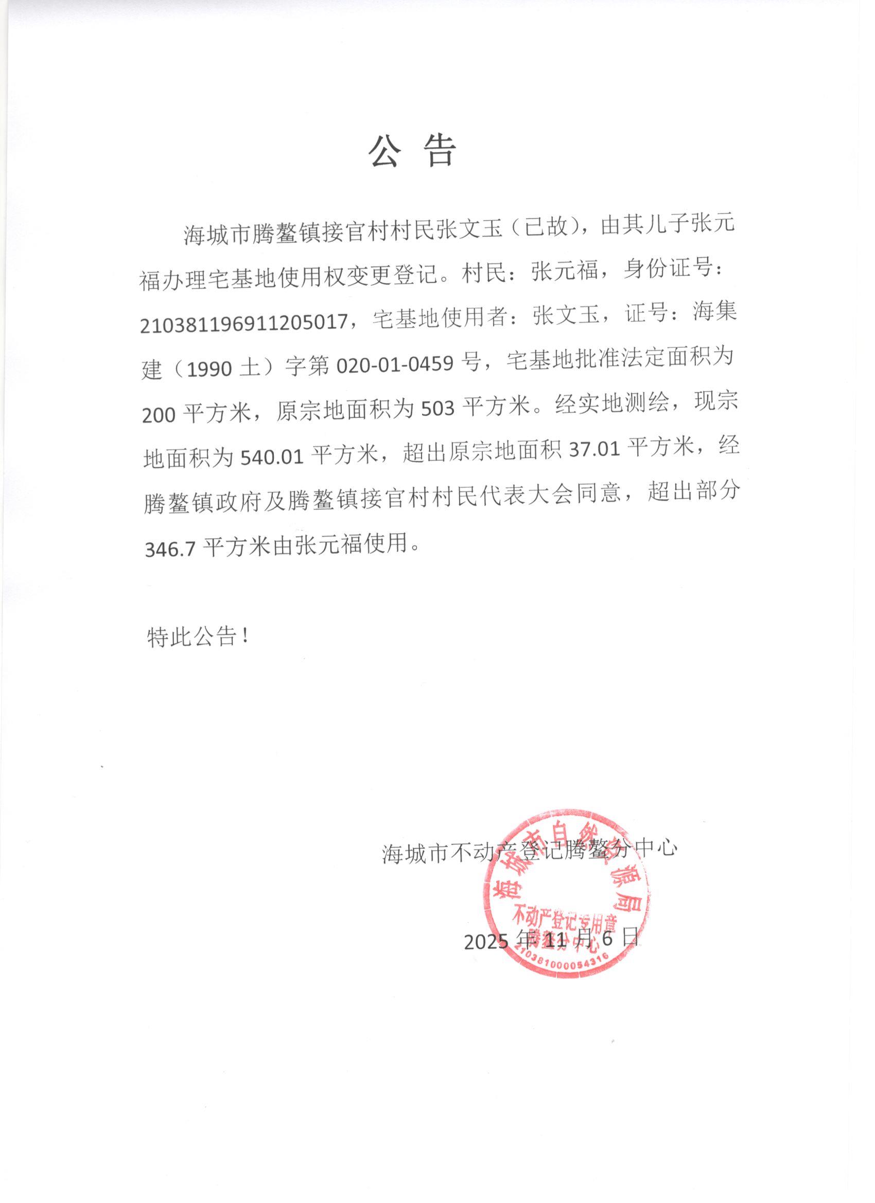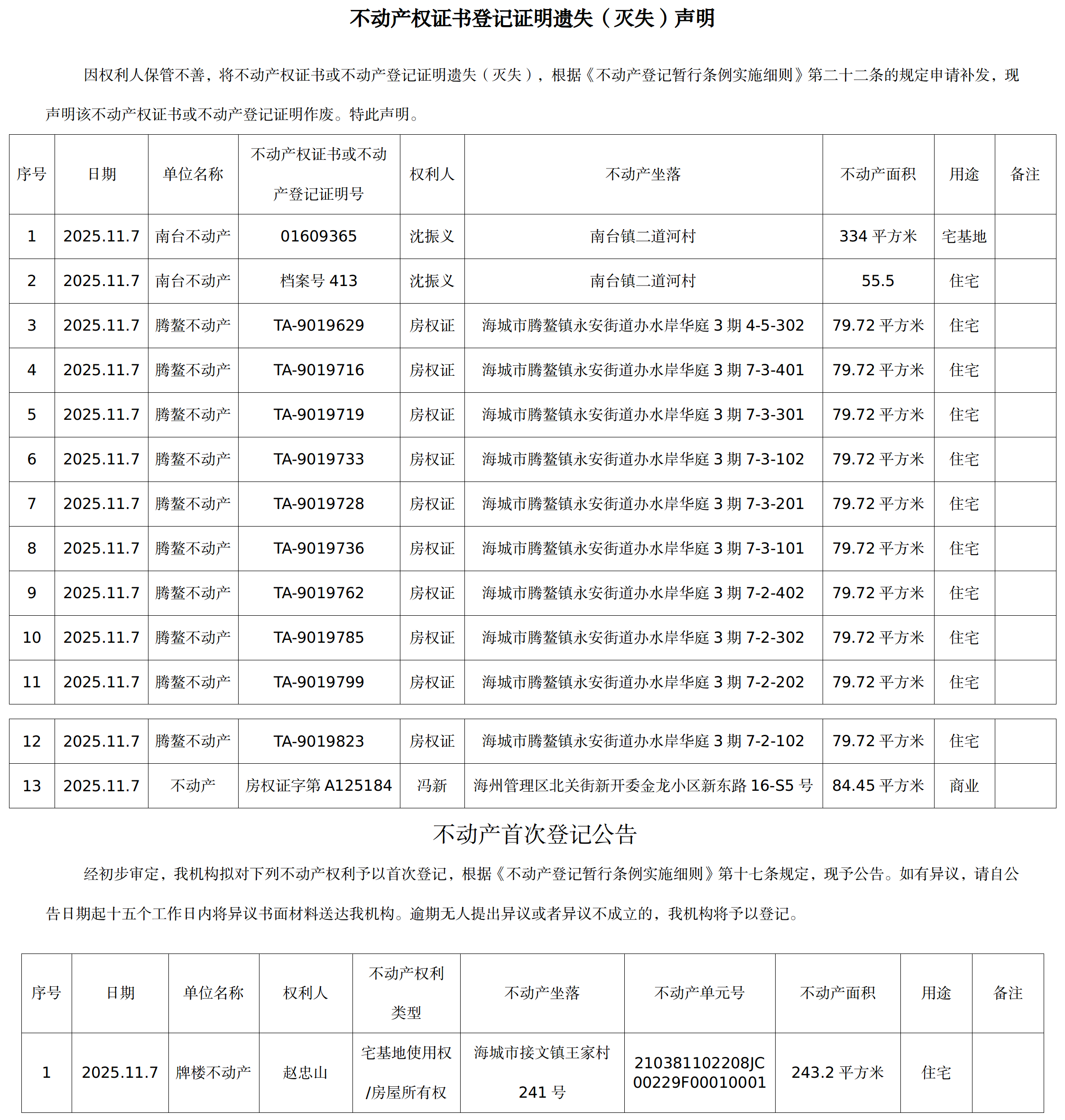 不动产相关信息公告(20251107)