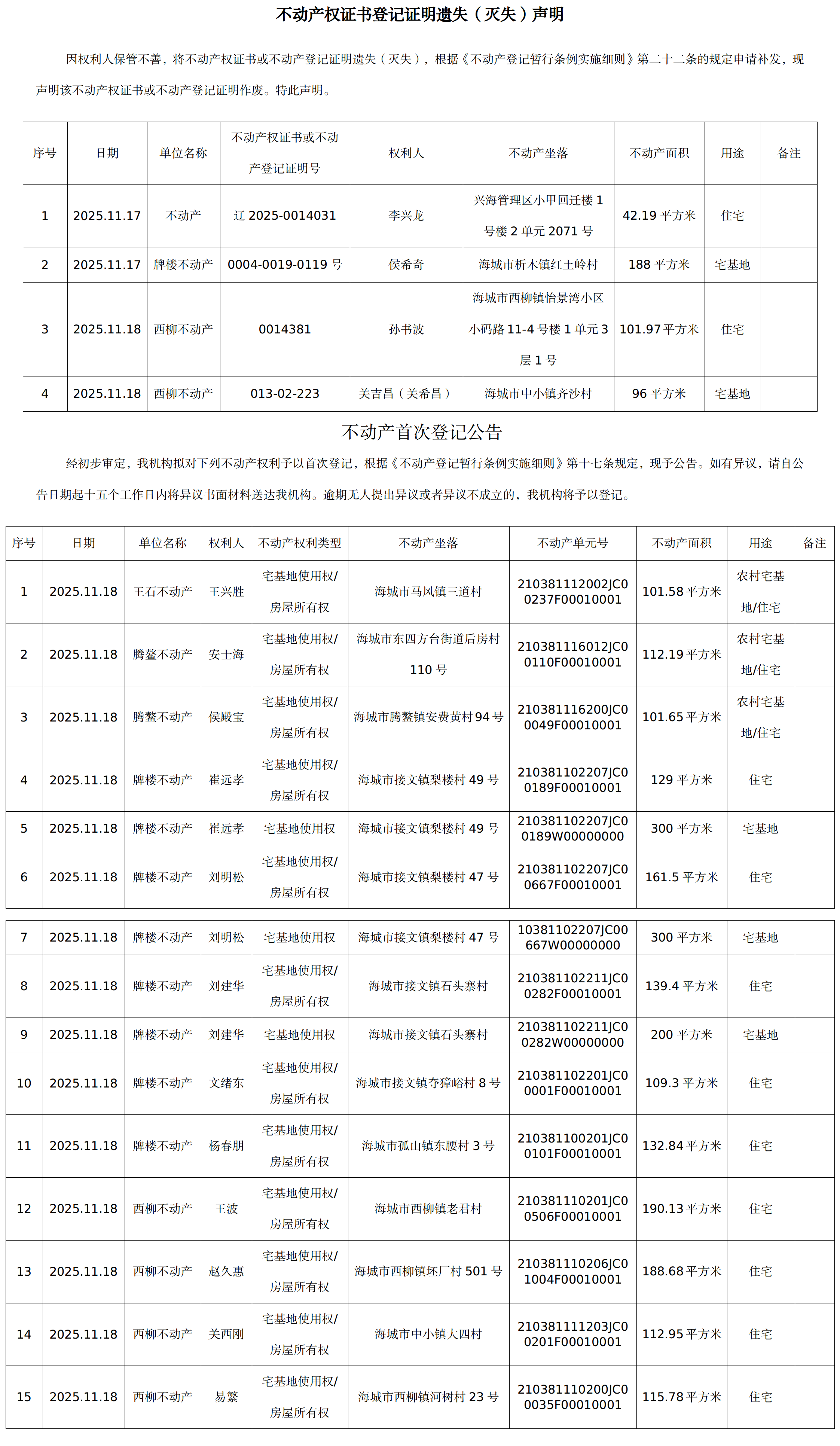不动产相关信息公告(20251118)