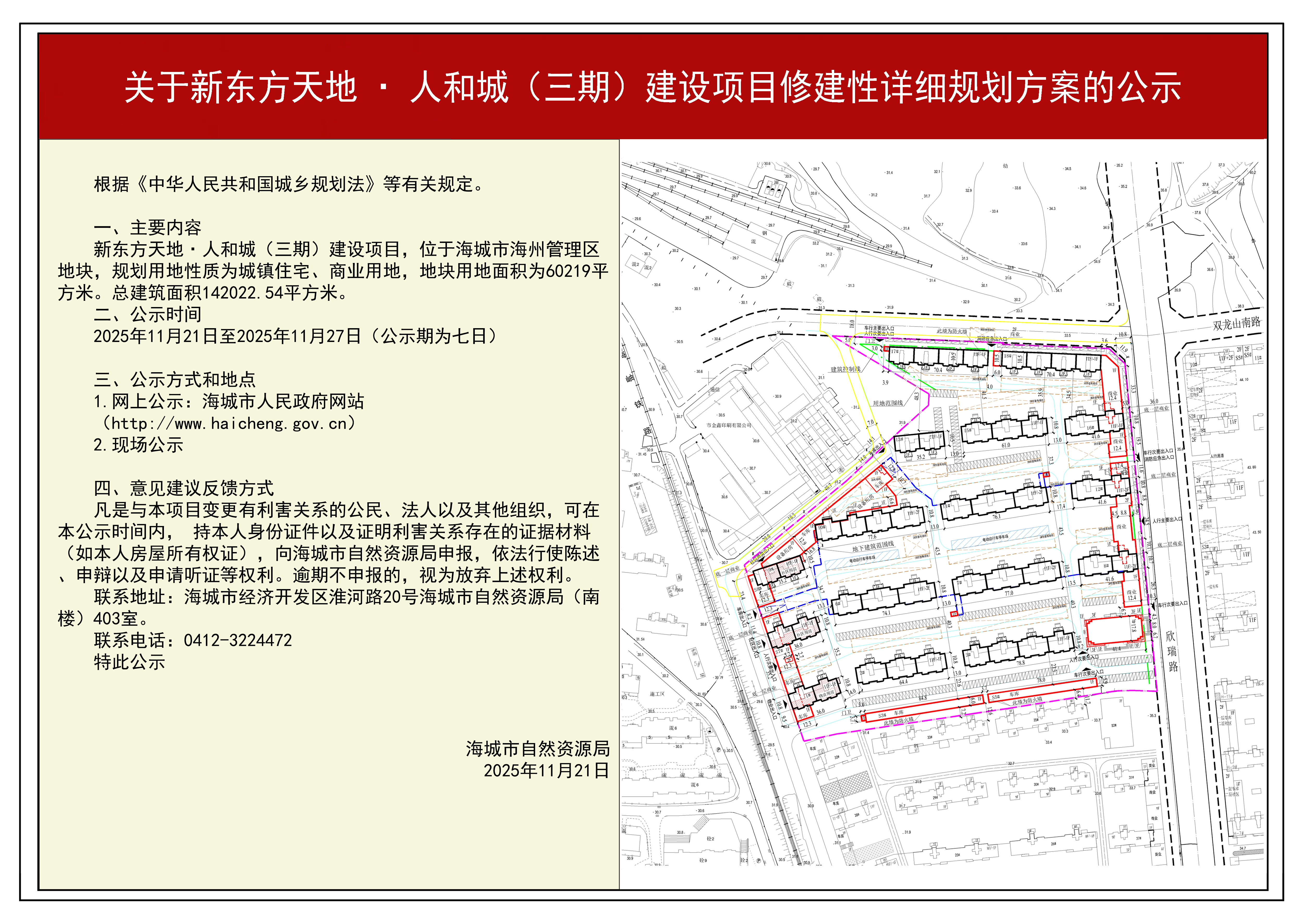 为切实增强规划的科学性、合理性和可行性,征求公众意见,根据《中华人民共和国城乡规划法》第二十六条规定,现将新东方天地人和城三期建设项目修建性详细规划方案内容公告如下: