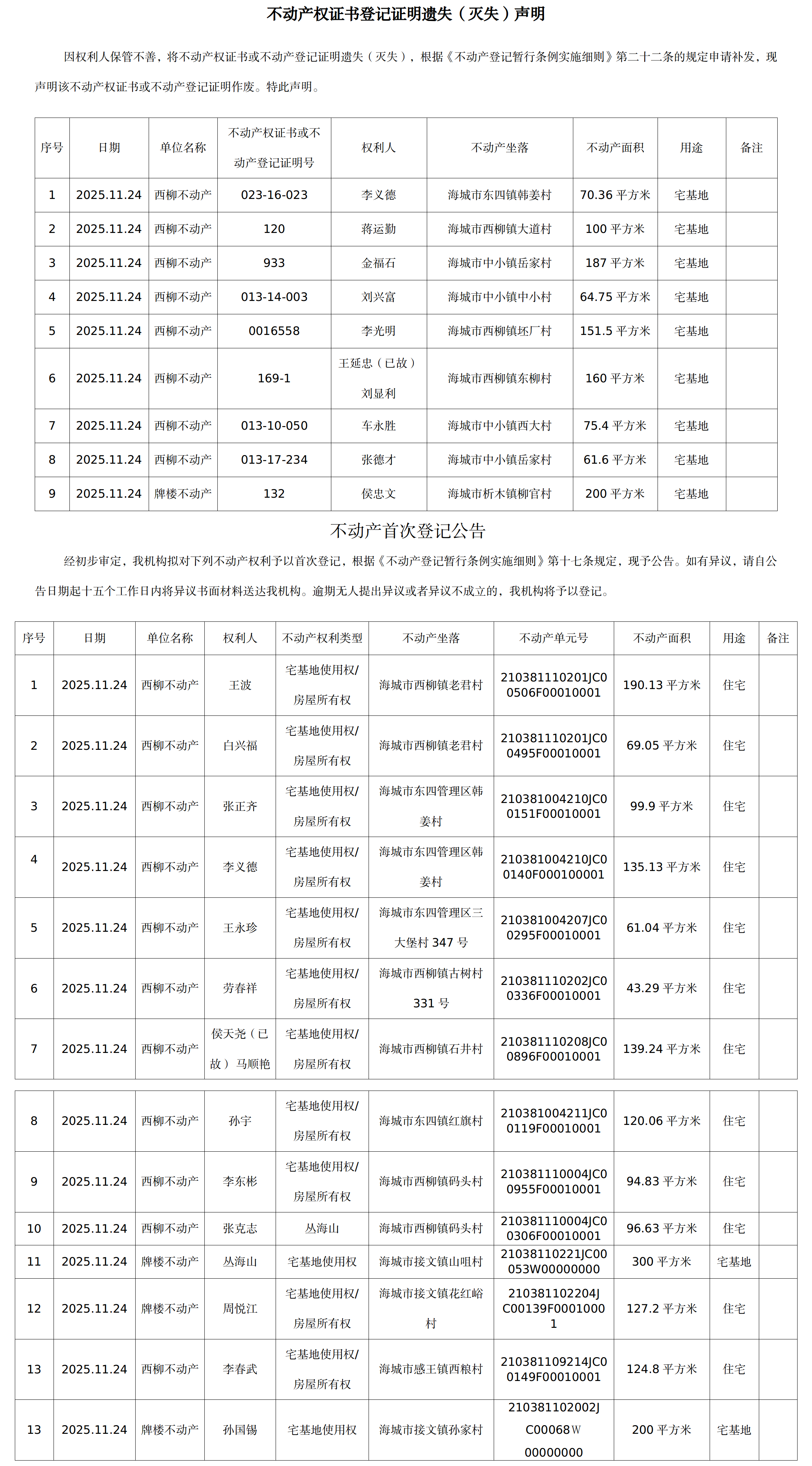 不动产相关信息公告(20251124)