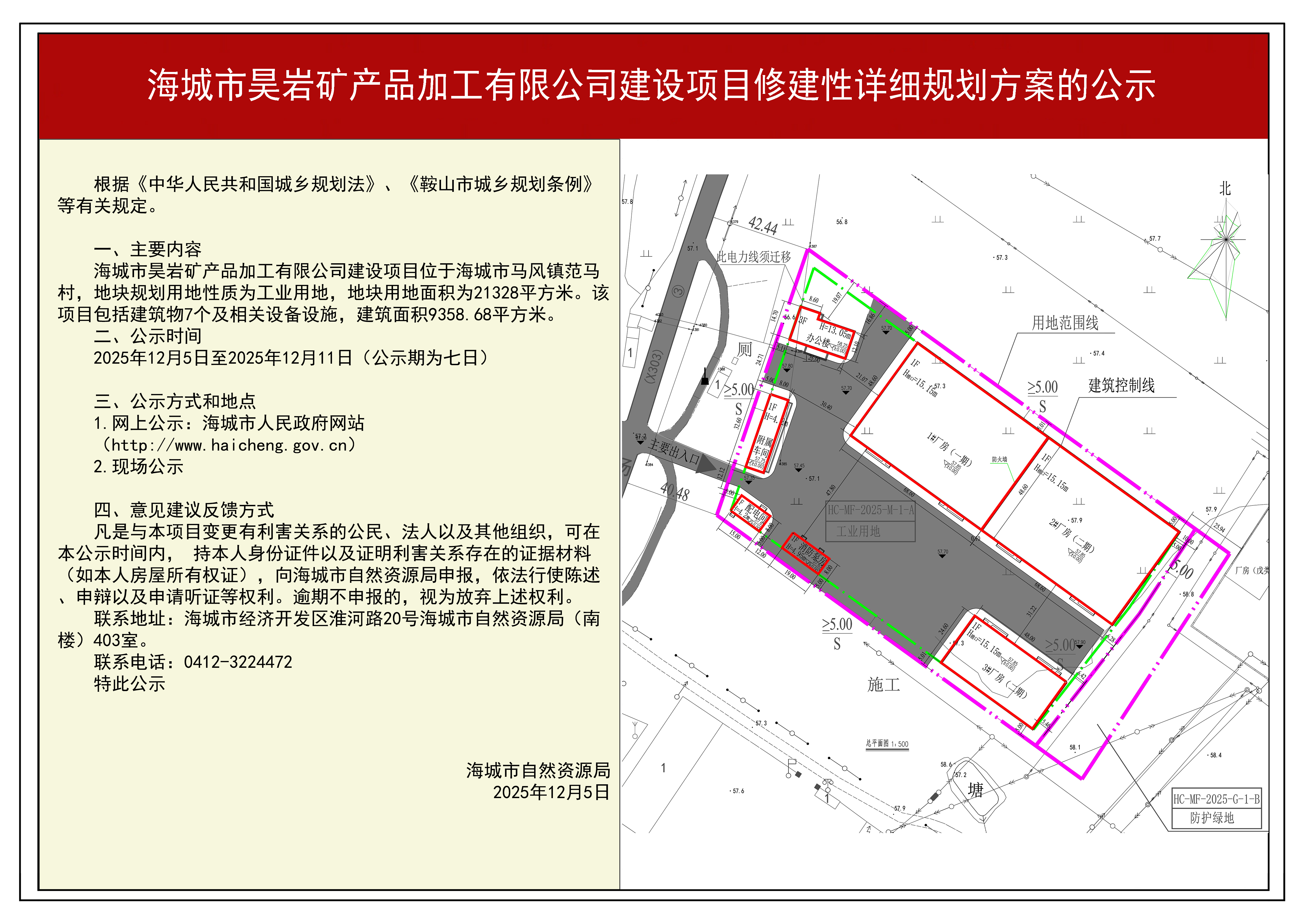 为切实增强规划的科学性、合理性和可行性,征求公众意见,根据《中华人民共和国城乡规划法》第二十六条规定,现将海城市昊岩矿产品加工有限公司建设项目修建性详细规划内容公告如下: