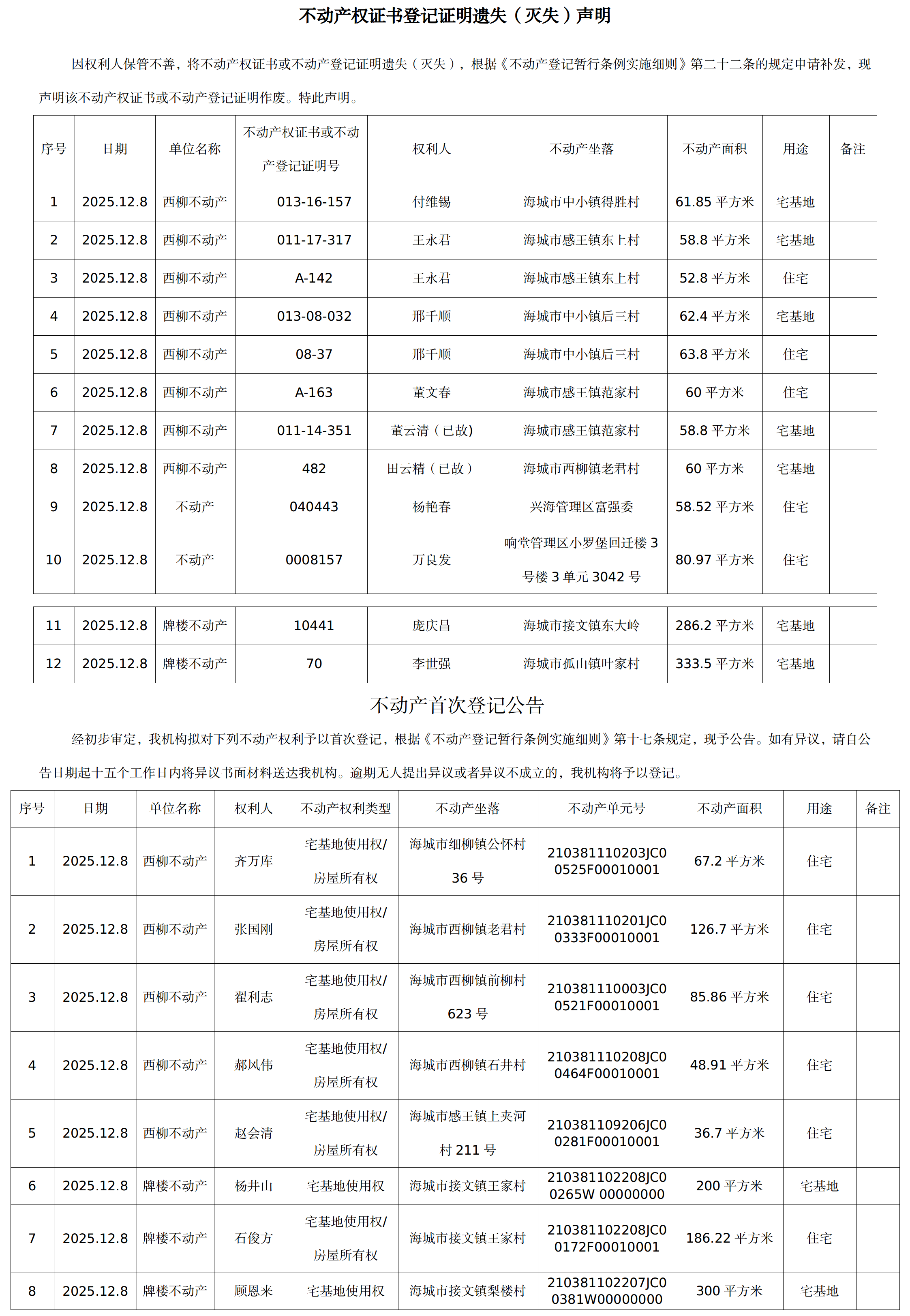不动产相关信息公告(20251208)