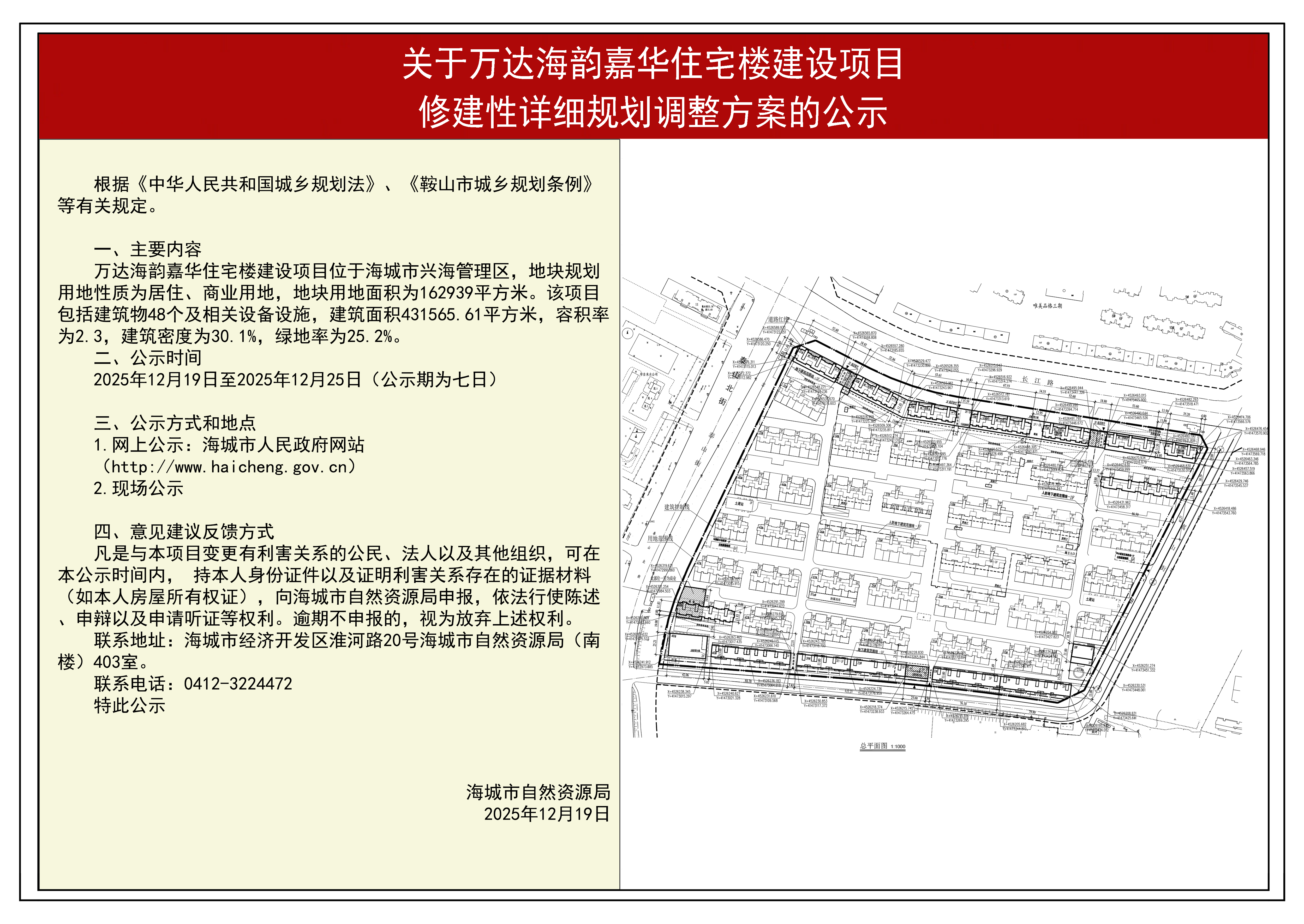 为切实增强规划的科学性、合理性和可行性,征求公众意见,根据《中华人民共和国城乡规划法》第二十六条规定,现将万达海韵嘉华住宅楼建设项目修建性详细规划调整内容公告如下: