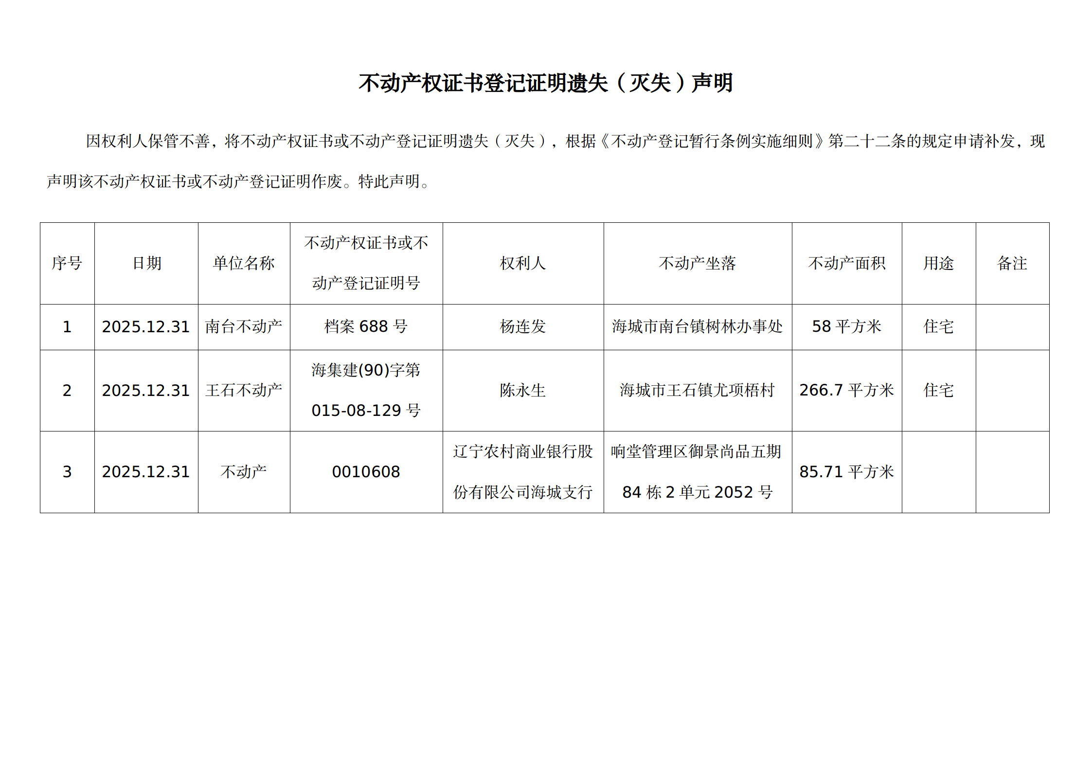 不动产相关信息公告(20251231)