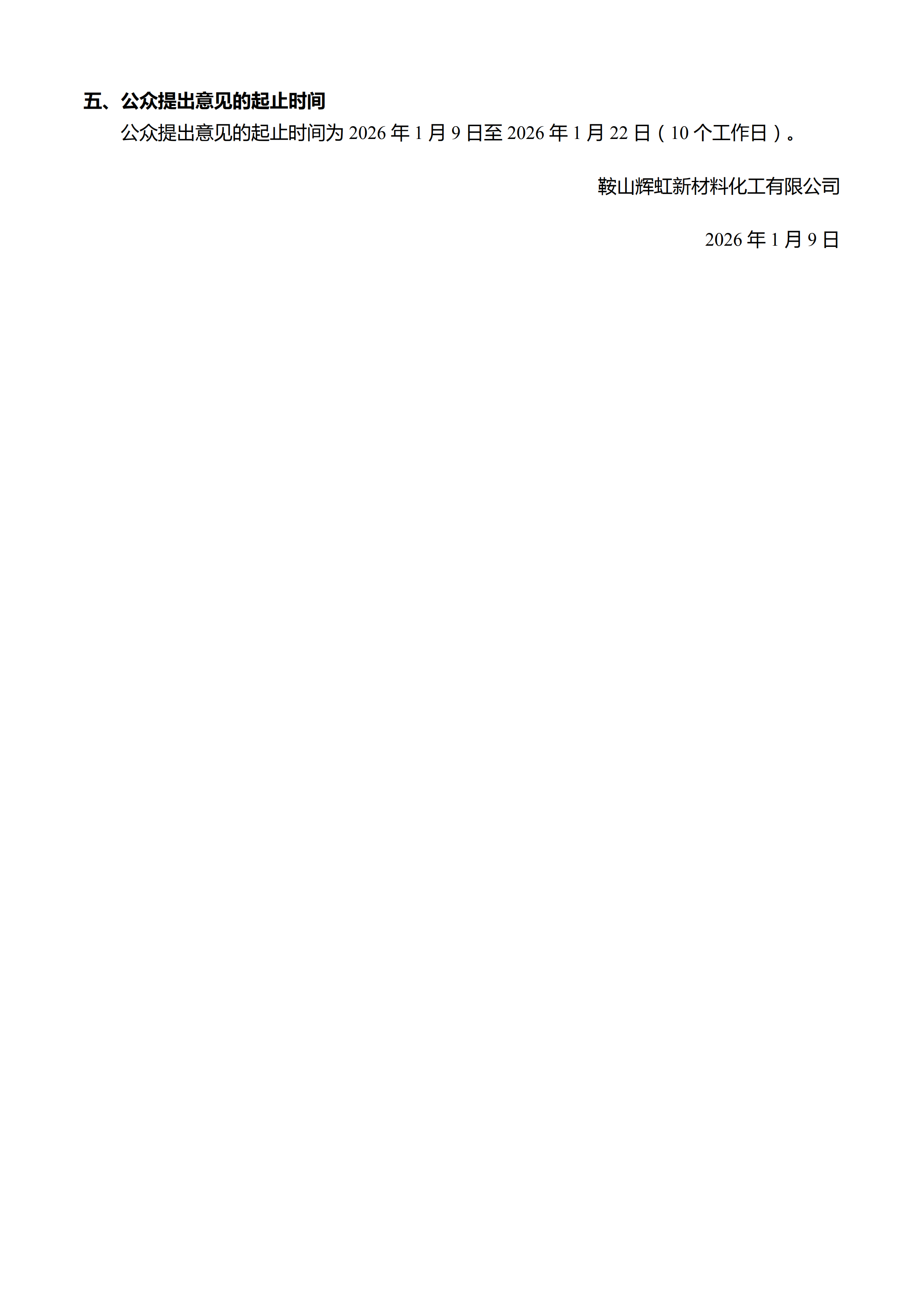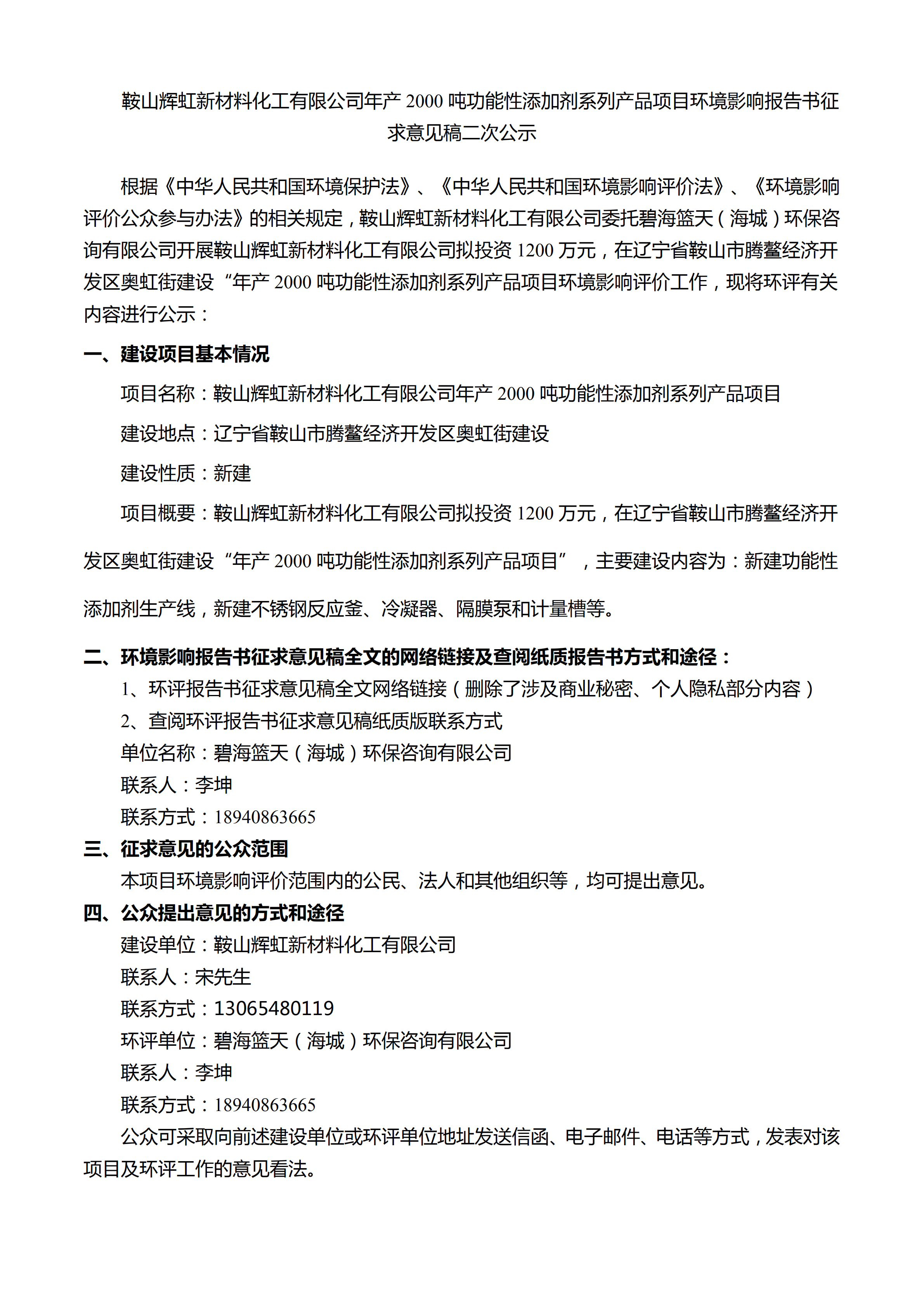 鞍山辉虹新材料化工有限公司年产2000吨功能性添加剂系列产品项目环境影响报告书征求意见稿二次公示