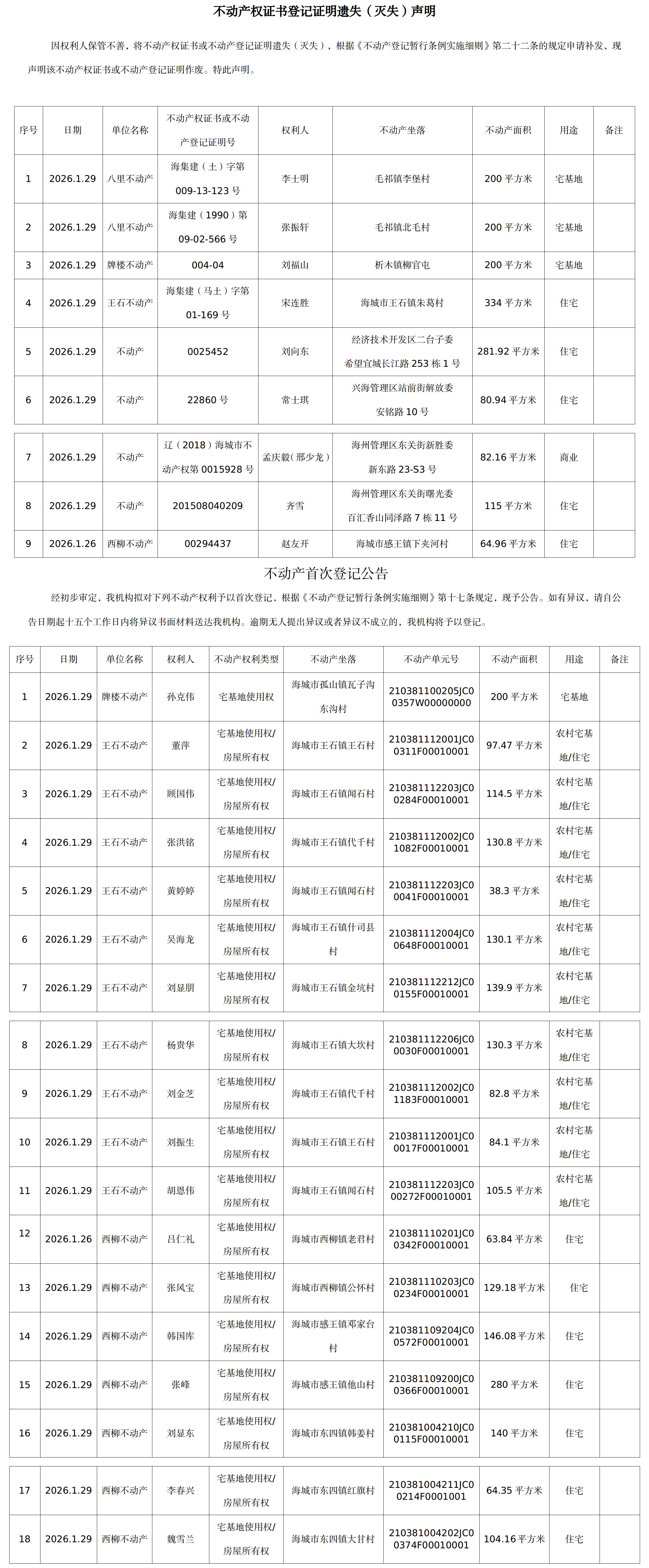 不动产相关信息公告(20260129)