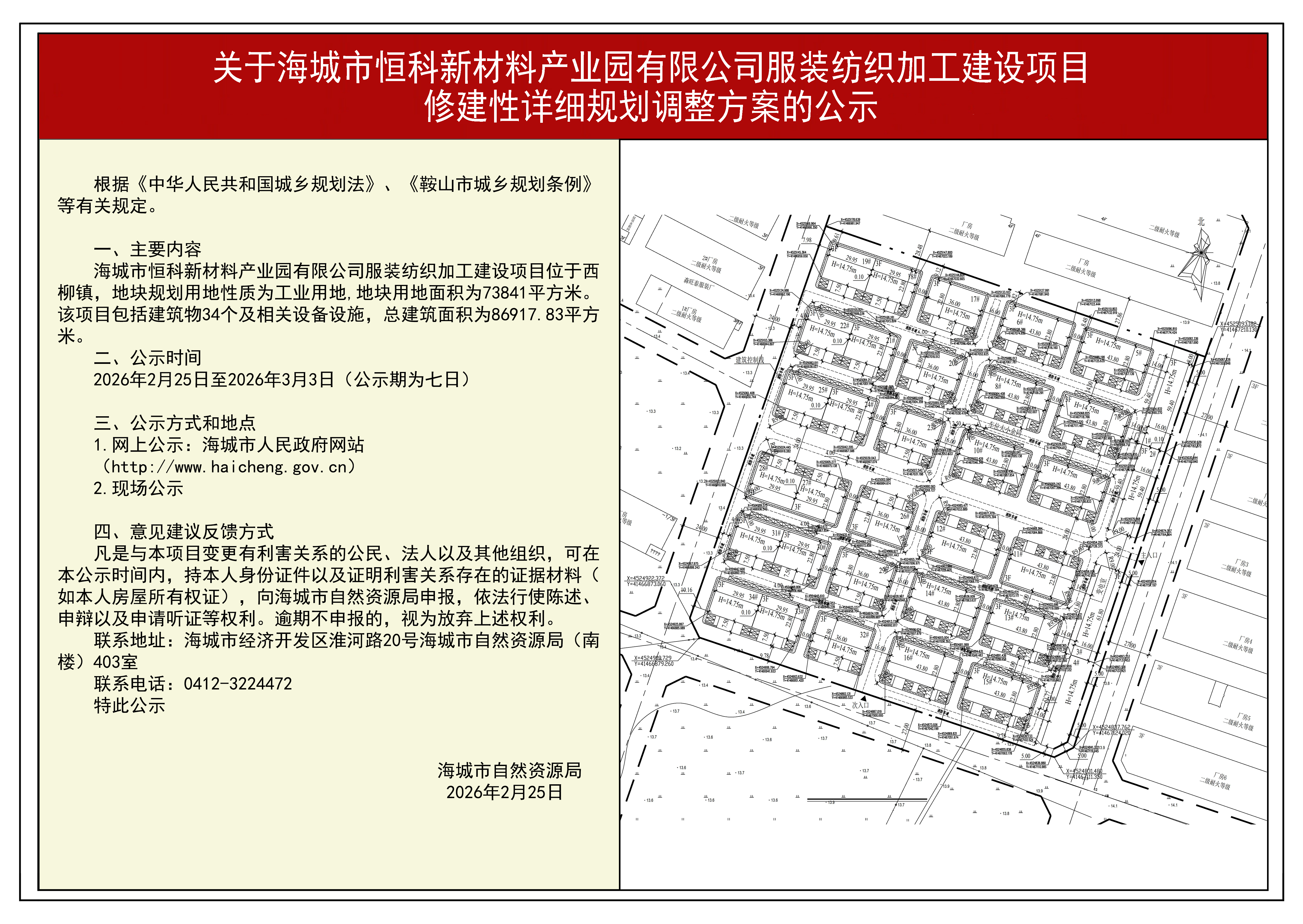 为切实增强规划的科学性、合理性和可行性,征求公众意见,根据《中华人民共和国城乡规划法》第二十六条规定,现将海城市恒科新材料产业园有限公司服装纺织加工建设项目修建性详细规划调整方案内容公告如下: