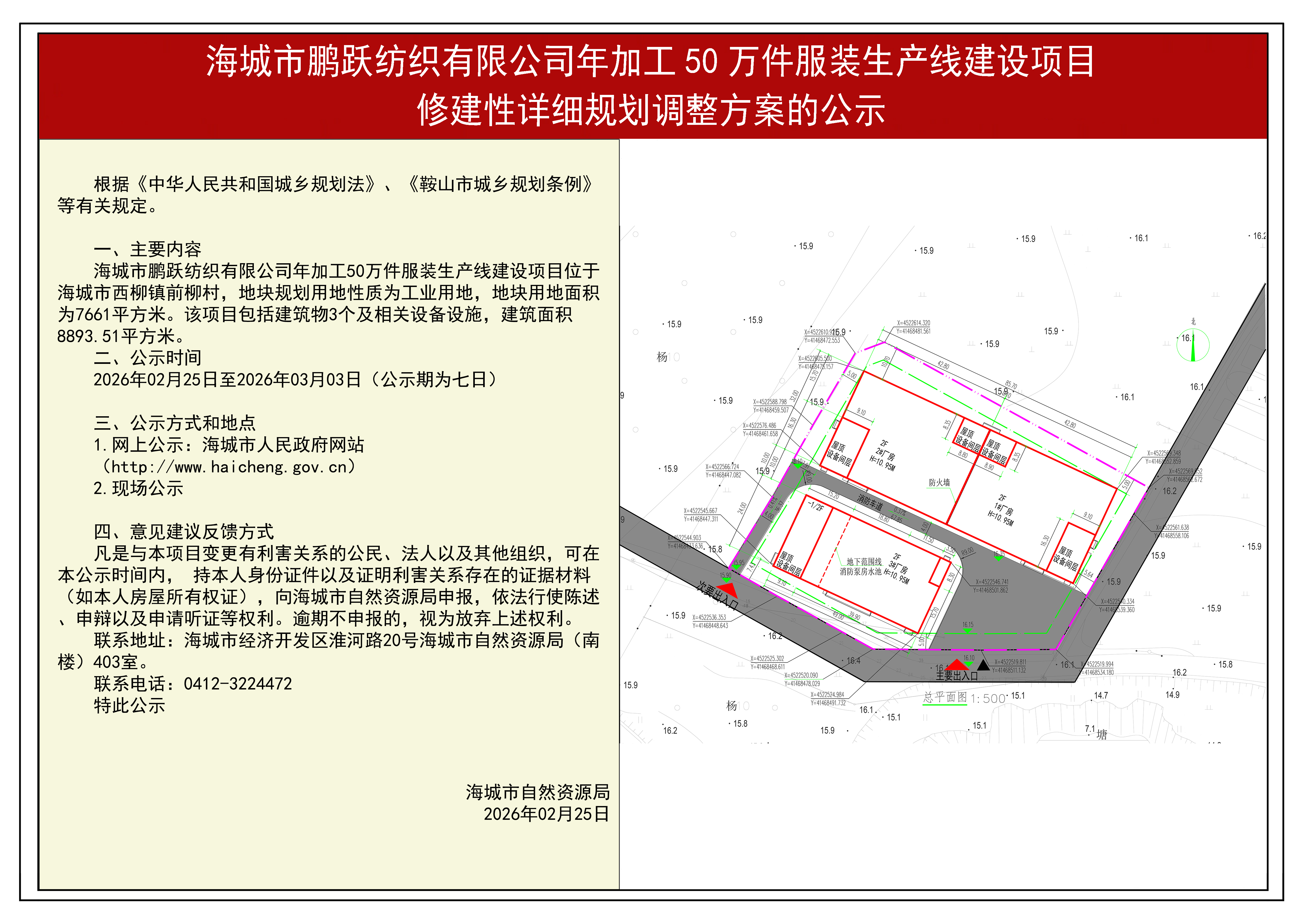为切实增强规划的科学性、合理性和可行性,征求公众意见,根据《中华人民共和国城乡规划法》第二十六条规定,现将海城市鹏跃纺织有限公司年加工50万件服装生产线建设项目修建性详细规划调整方案内容公告如下: