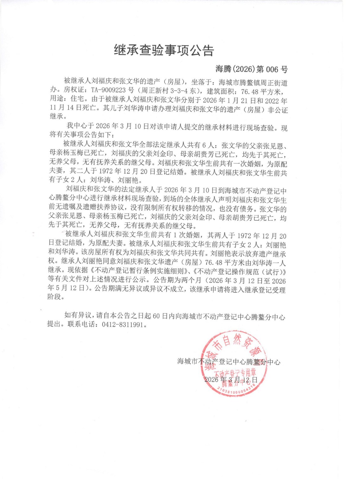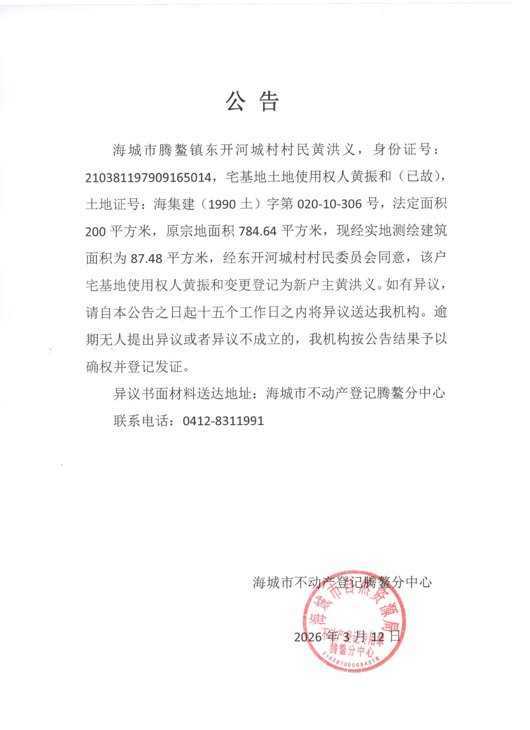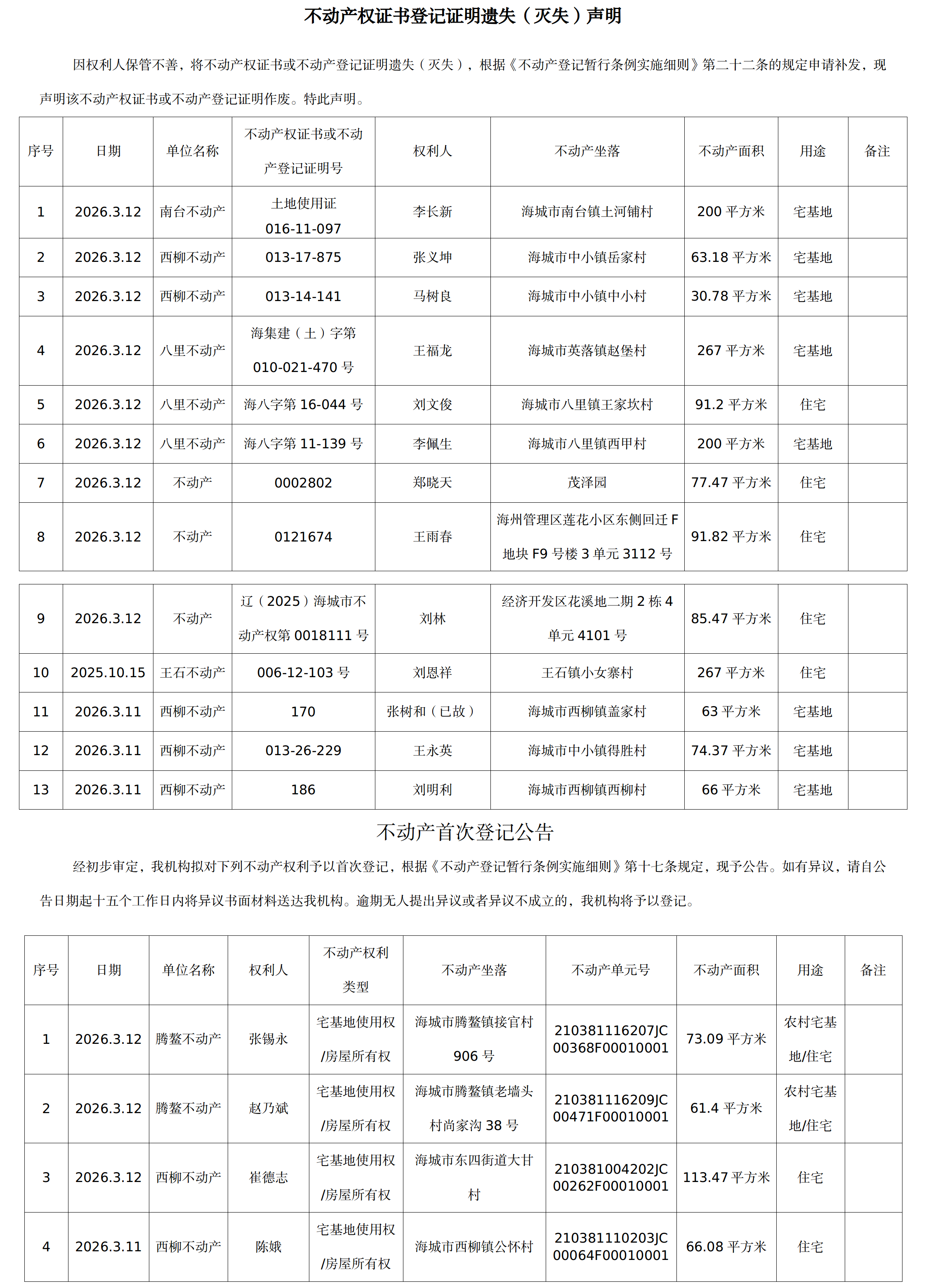 不动产相关信息公告(20260312)