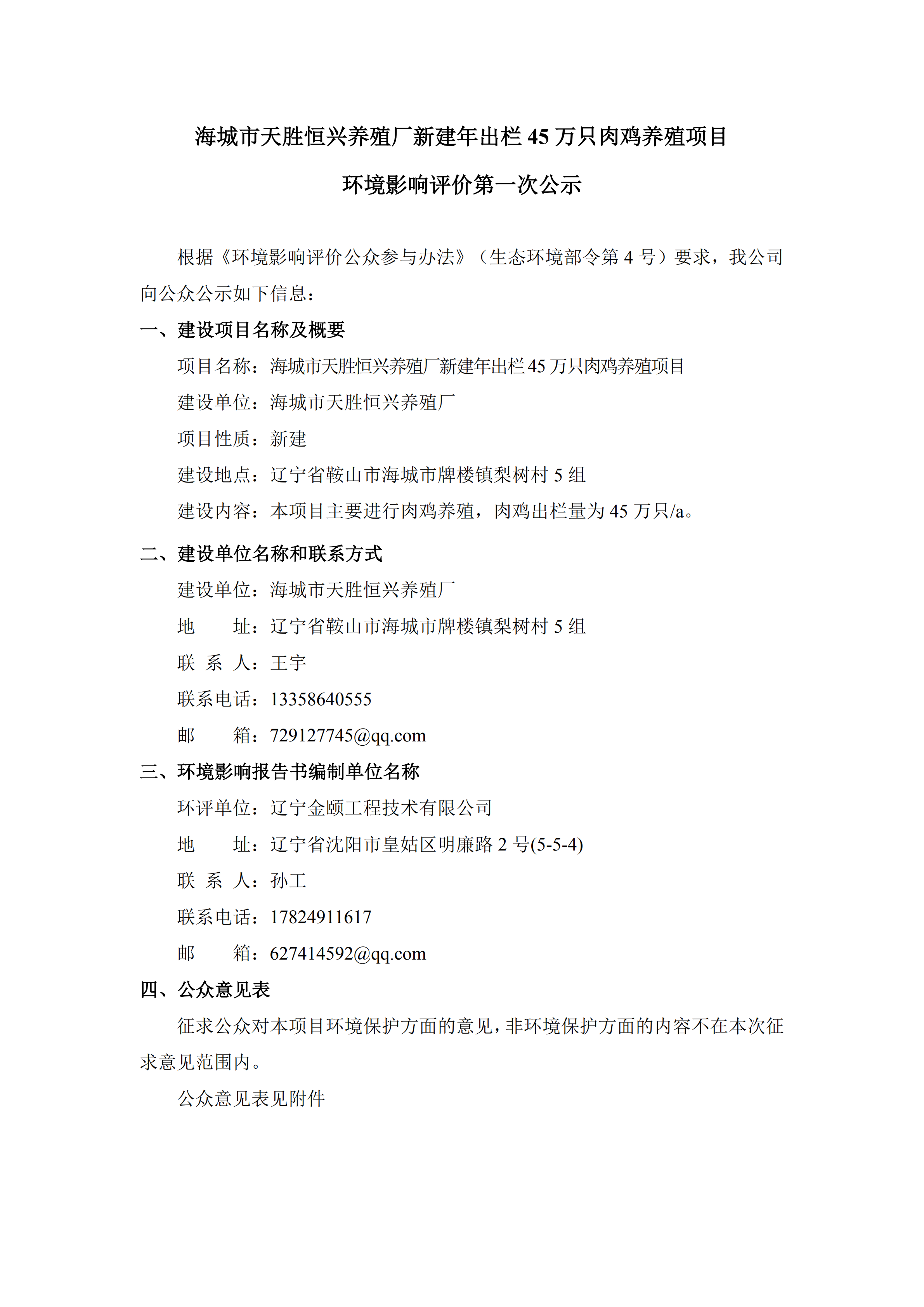 海城市天胜恒兴养殖厂新建年出栏45万只肉鸡养殖项目环境影响评价第一次公示
